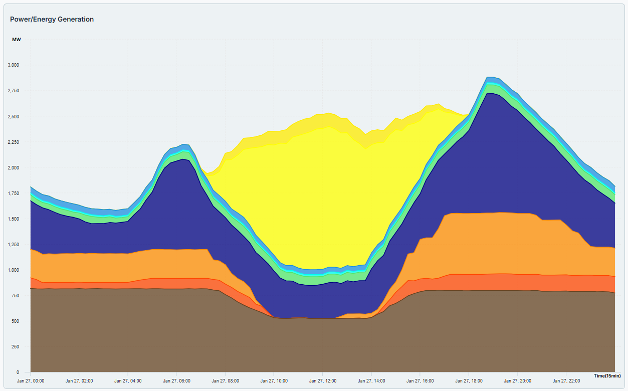 One of the most useful features is the Daily Generation Profile, which shows the country’s energy mix for a given day. For example, the chart for 27 January 2026 highlights how different energy sources worked together to meet the nation’s electricity demand.